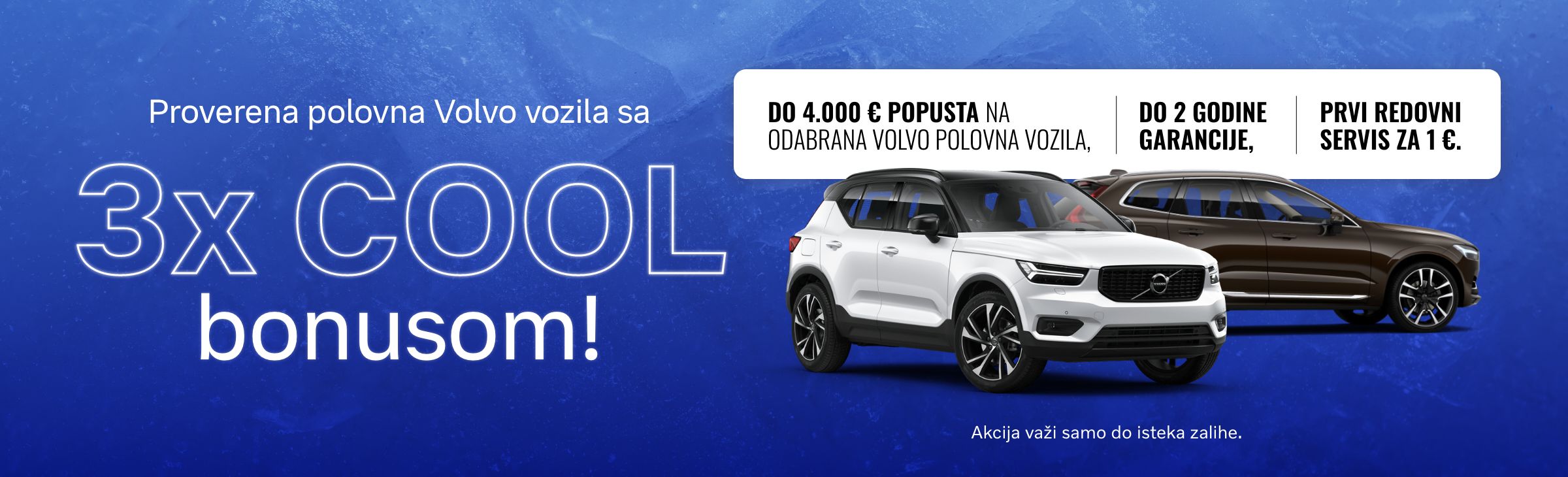 Vrhunska ponuda polovnih vozila sada dolazi obogaćena uključenim 3x bonus pogodnostima: do 4.000 € popusta na odabrana Volvo polovna vozila, do 2 godine garancije i prvi redovni servis za 1 €!